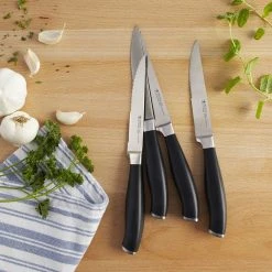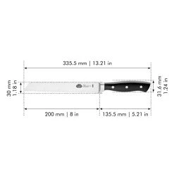 - Fabricated from high quality German stainless steel for durability and strength with a satin-finished blade is tempered and honed to a 15 degree edge angle for long-lasting sharpness
