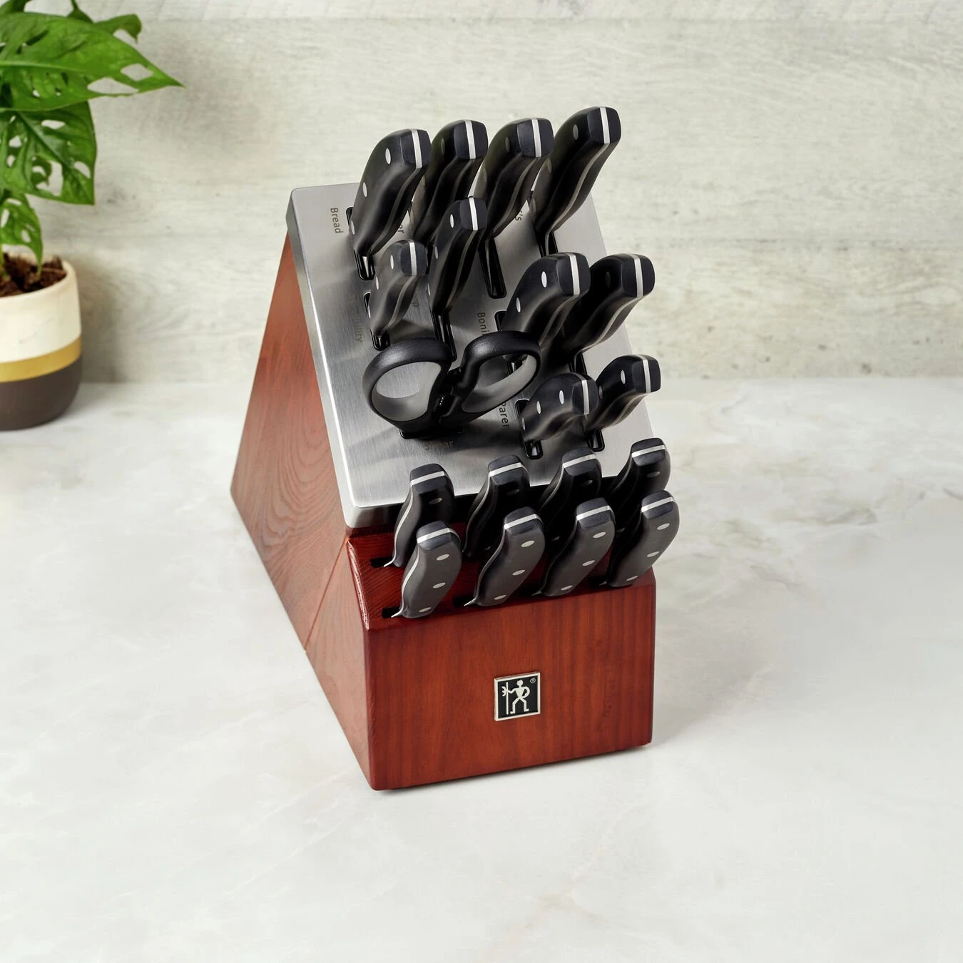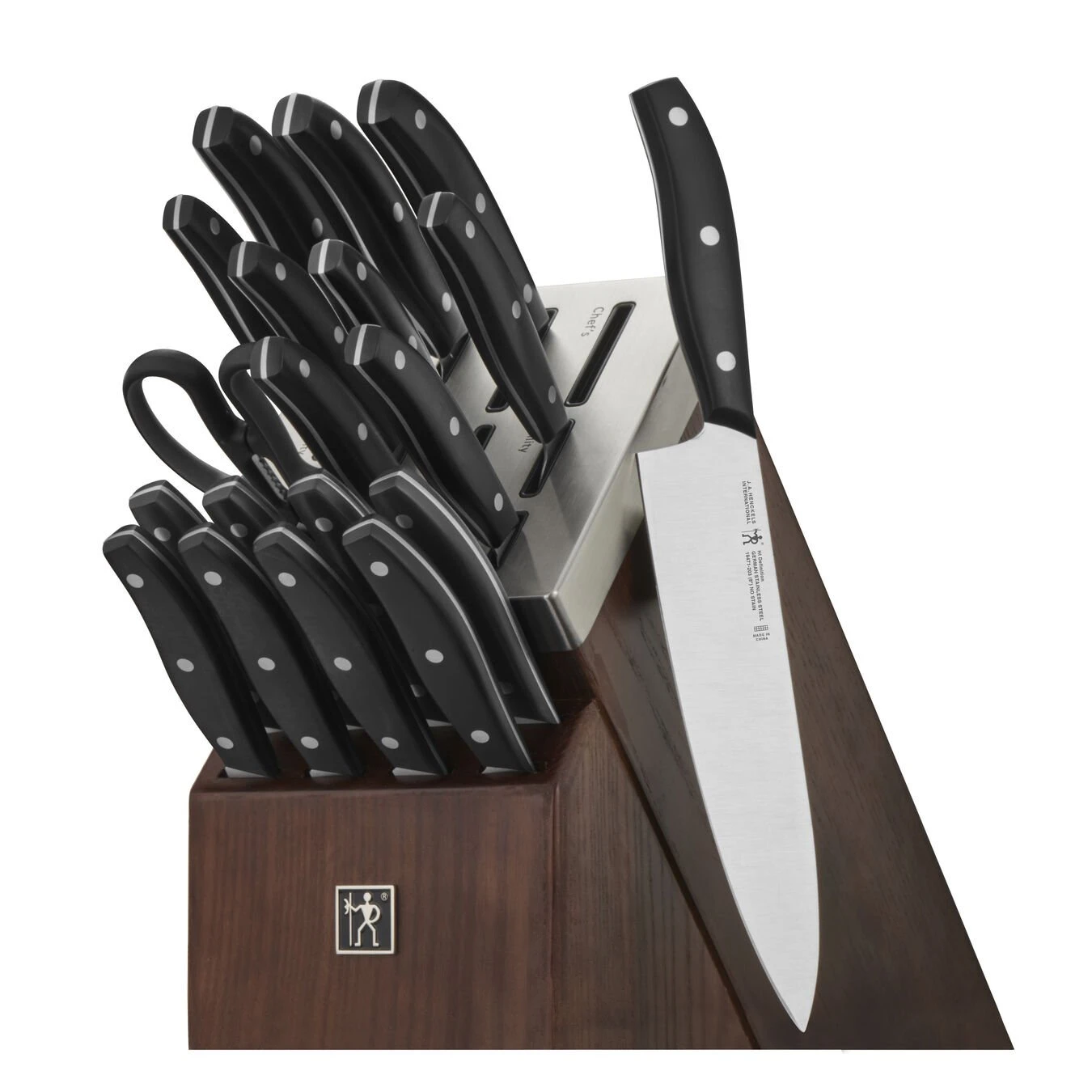 Henckels makes essential kitchen tools that every home chef needs. Created in 1895, this time-honored brand offers high quality at an exceptional value.Sharpness is always in reach with Henckels Self-Sharpening Definition Knife Blocks. The self-sharpening slots boast built-in ceramic honing wheels that automatically sharpen when knives are stored or removed. The remaining slots are for serrated knives, whose toothed blades never need sharpening.With these must-have knife blocks, enjoy effortless sharpness for precise prep work every time. Plus, their handsome stained ash wood base and stainless steel cap add aesthetic appeal to your countertop.Tailor-made for J.A. Henckels Definition knives, these blocks help you maintain the superior sharpness of their fine edge, precision-honed blades. With a seamless transition from blade to handle, the knives’ fully forged construction provides balance while their traditional triple-rivet handle encourages tireless cutting.