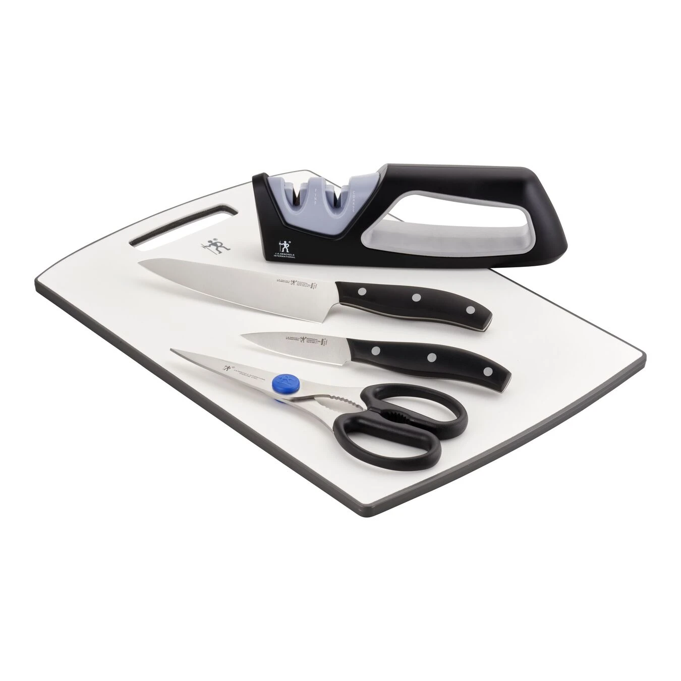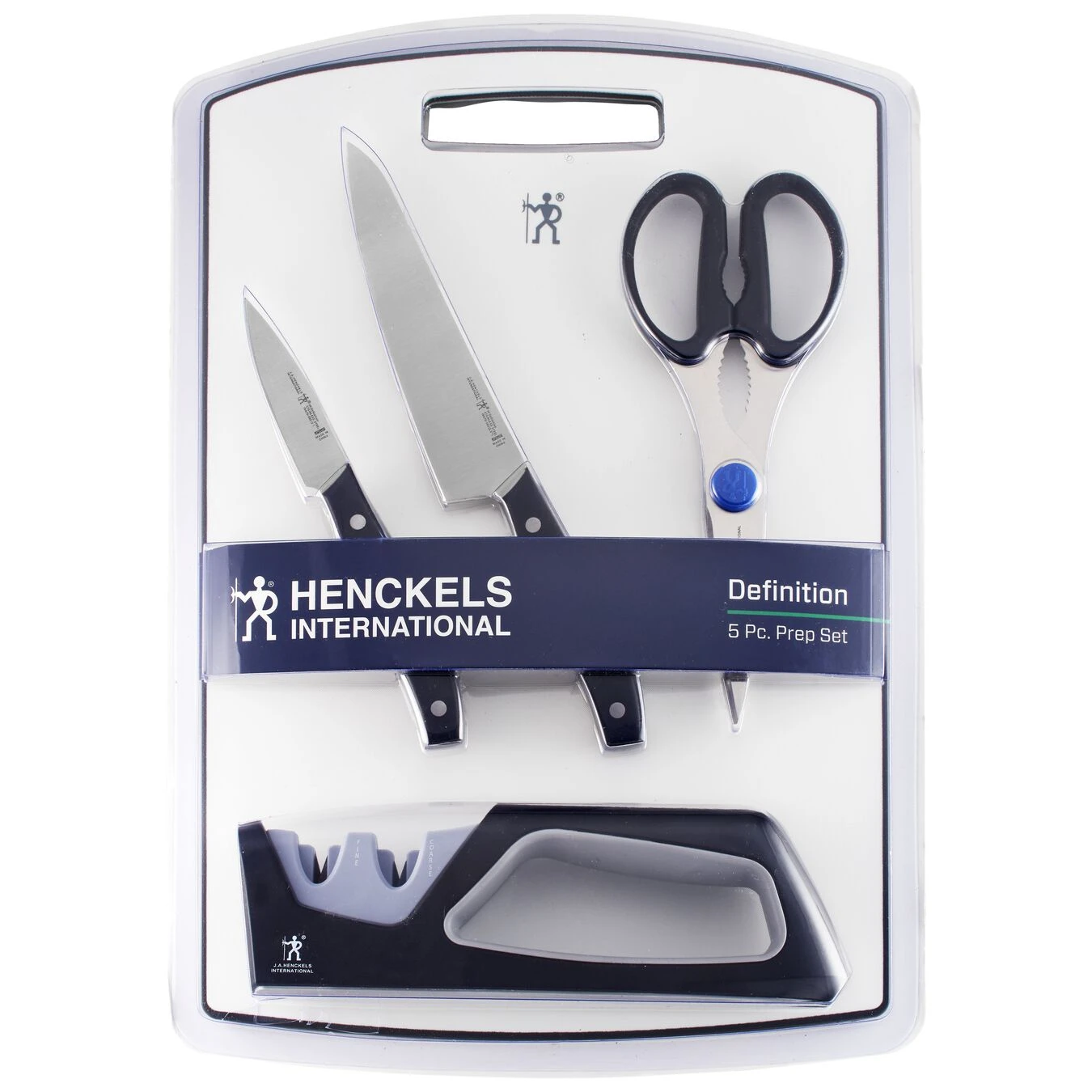 The Henckels Definition 5-pc Essential Prep Set helps you handily tackle kitchen tasks with ease. Thanks to the 5.5″ Prep Knife’s versatile, new blade shape, you can confidently chop vegetables and fruit, slice meats and cheese, butterfly chicken breasts and so much more. This innovative blade design allows for ample knuckle clearance for cutting board work yet is small enough for in-hand tasks.The 3″ Paring Knife is perfect for peeling fruits and vegetables. Honed for long-lasting sharpness – which you can maintain with the Prep Set’s sharpener – both knives’ fine-edge blades boast precision cutting and peeling. Curved for comfort, the traditional, three-rivet handles are pleasant to grip for tireless, balanced cutting on the set’s plastic cutting board.Henckels makes essential kitchen tools every home chef needs. From steak knives to spatulas, each product offers high quality at an exceptional value. Created in 1895 by Zwilling J.A. Henckels, this value-driven brand guarantees the same durability, design and ease of use for which the global company is known. Equip your kitchen with expertise with Henckels.