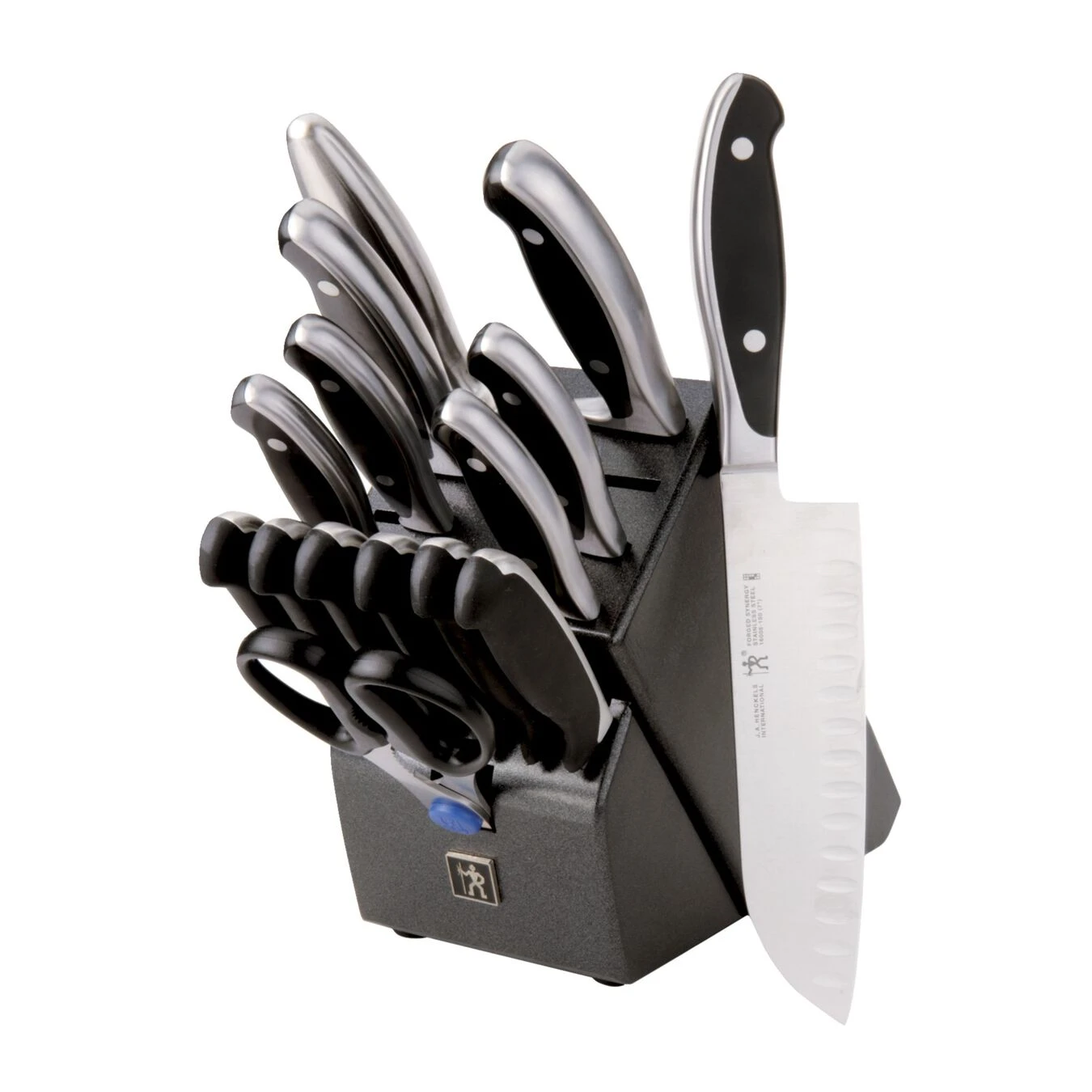 This 16-piece “East Meets West” block set is stocked with both Asian and Western style knives. The set features both an Asian-style kudamono paring knife with a lightweight body that is ideal for intricate vegetable work, and a Western-style paring knife for other small-scale tasks in the kitchen. The Asian-style hollow edge santoku features a blade that has small indentations, called grantons, which prevent food from sticking while cutting and is designed to facilitate the Asian push-cut.