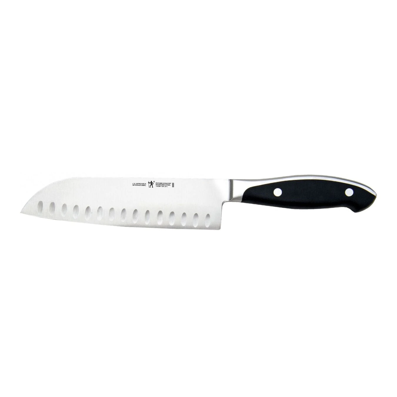 The Henckels Forged Synergy 5″ Hollow Edge Santoku Knife allows you to cut with confidence. Fabricated from high-quality German stainless steel, the Santoku – Japanese for “three virtues” – excels at three cutting techniques. Expertly mince garlic, slice cucumber, and dice onions with this Asian all-rounder, whose hollow edge blade has small indentations, aka grantons, which prevent food from sticking while cutting.The forged bolster construction seamlessly transitions from blade to handle for durability and balance. Designed for comfort and style, the ergonomic double-rivet handle features a sleek, stainless steel backing that looks as good as it feels.Henckels makes essential kitchen tools every home chef needs. From steak knives to spatulas, every product boasts high quality at an exceptional value. Created in 1895 by Zwilling J.A. Henckels, this value-driven brand guarantees the same durability, design and ease of use for which the global company is known. Equip your kitchen with expertise with Henckels.