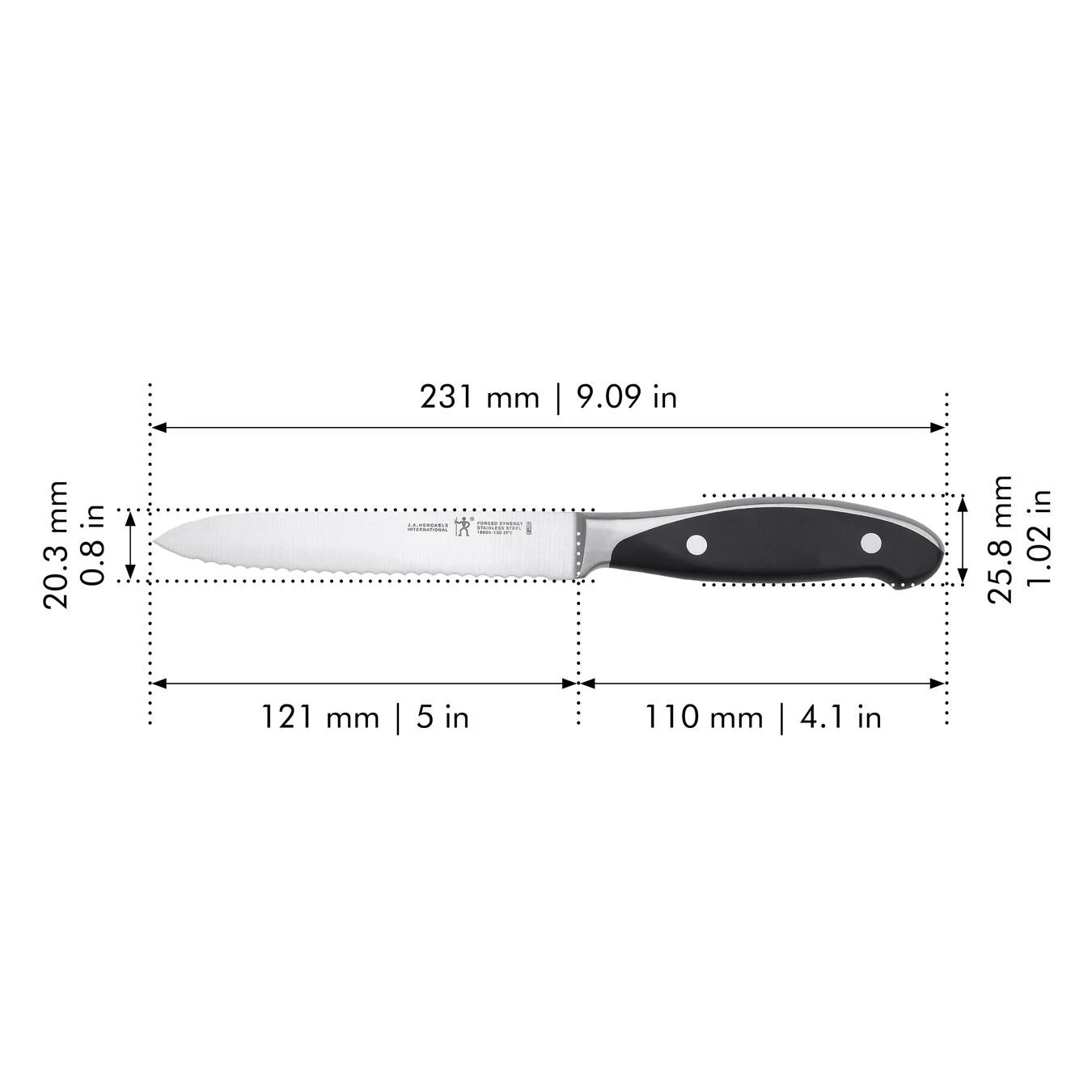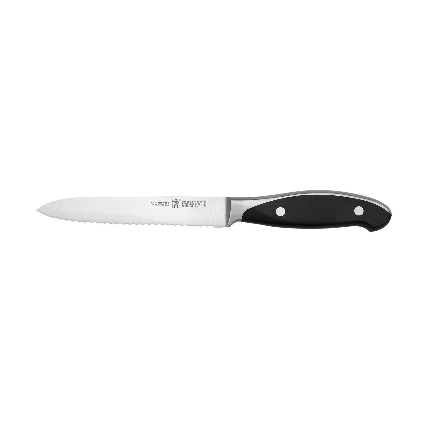 The Forged Synergy serrated utility knife is ideal for cutting soft interior, hard exterior foods. Cut tomatoes, sausages, bread, and cheese effortlessly with this small, versatile knife.