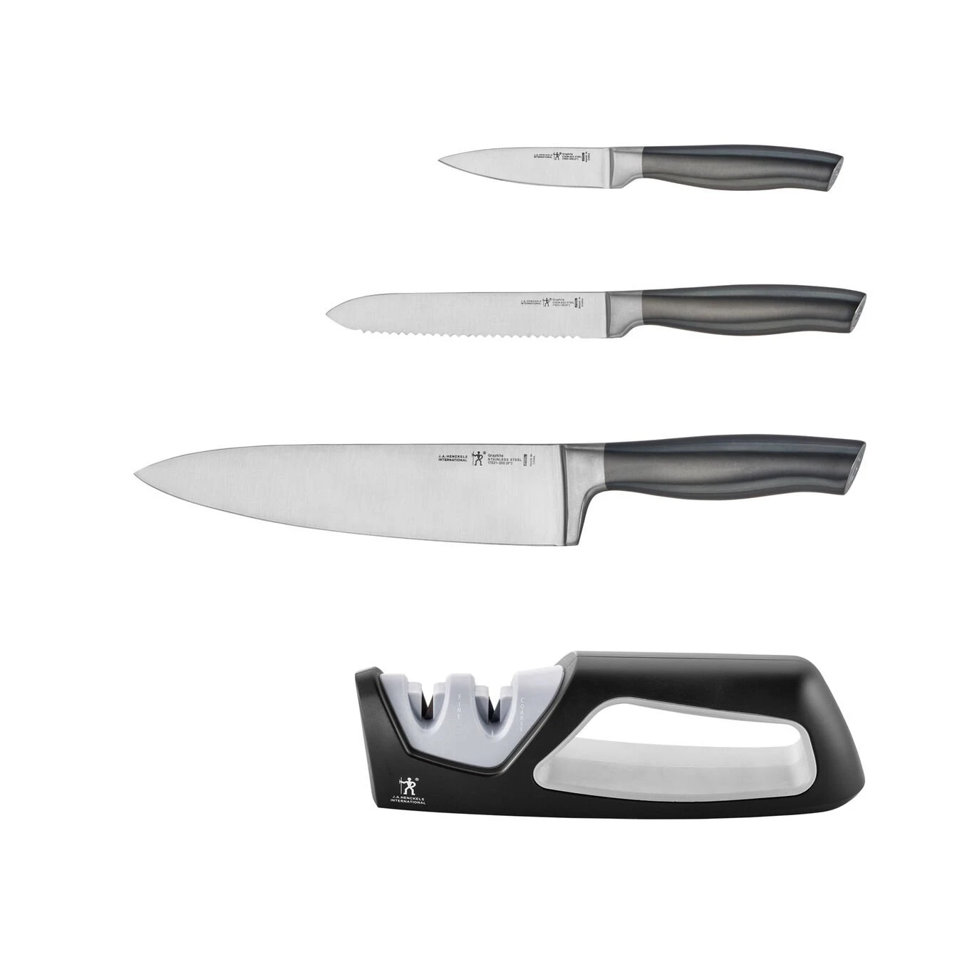 - Set includes 8-inch chef’s knife, 5-inch serrated utility, 3-inch paring knife, and handheld sharpener
