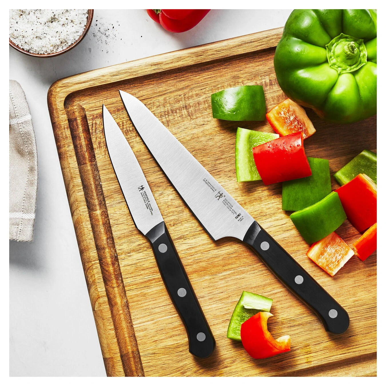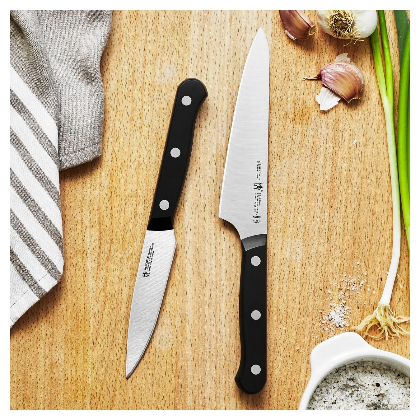 Equip your kitchen for less with these essential knives. The 2-piece prep set features two workhorses in the kitchen: the prep knife and the paring knife. The compact all-rounder prep knife is for precision cutting jobs in-hand or on a cutting board, while the paring knife is ideal for smaller scale jobs like peeling vegetables and segmenting fruit. Honed for long-lasting sharpness, these fine-edge blades make fast work of kitchen prep. Since 1895, Henckels has been making high quality knives at an exceptional value. Solution knives are designed to tackle every kitchen task. Fabricated from high-quality stainless steel, the single-piece, precision-stamped knife blades are lightweight without sacrificing strength and durability. Curved for comfort, the break-proof, triple-rivet handles are pleasant to grip, giving you the control you need to slice through tougher cuts with ease. This ergonomic handle lets you enjoy maximum maneuverability and fatigue-free cutting.