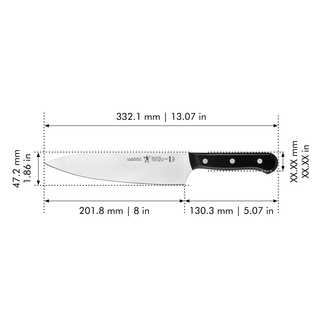 - Traditional triple-rivet handle offers balance and is curved for comfort