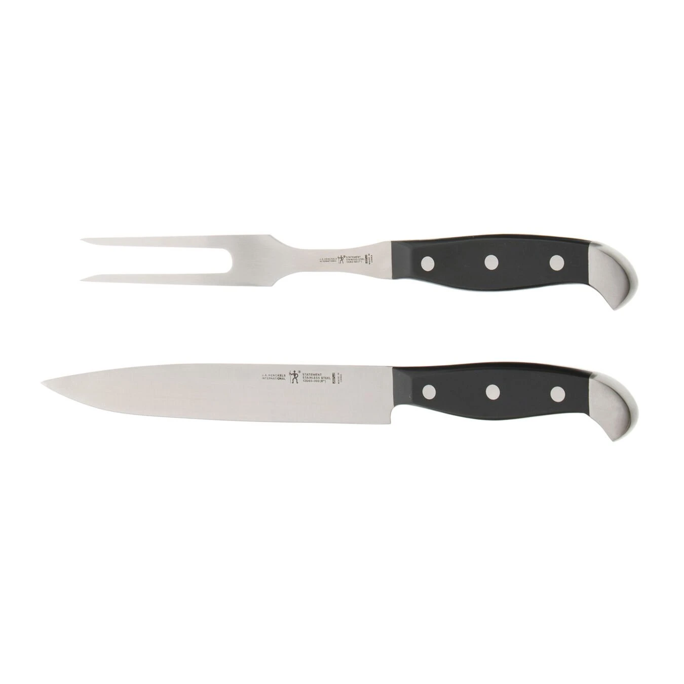 The Henckels Statement 2-pc Carving Set makes it easy to serve and slice meat beautifully. Honed for long-lasting sharpness, the fine-edge blade of the 8″ Slicing Knife boasts precision cuts. Used with the Carving Fork, confidently carve roast turkey, slice ham smoothly, and cut prime rib into succulent slices. Each time you cook meat, you will want to reach for this useful set.Fabricated from durable, high-quality stainless steel, Statement’s single-piece, stamped blade construction is lighter than forged knives. Along with the full tang, this encourages maximum maneuverability. The traditional triple-rivet handles are curved for comfort and balance while the stainless steel endcap adds aesthetic appeal to your block display. Each time you cook, you will want to reach for this useful knife set.Henckels makes essential kitchen tools every home chef needs. From steak knives to spatulas, each product boasts high quality at an exceptional value. Created in 1895 by Zwilling J.A. Henckels, this value-driven brand guarantees the same durability, design and ease of use for which the global company is known. Equip your kitchen with expertise with Henckels.
