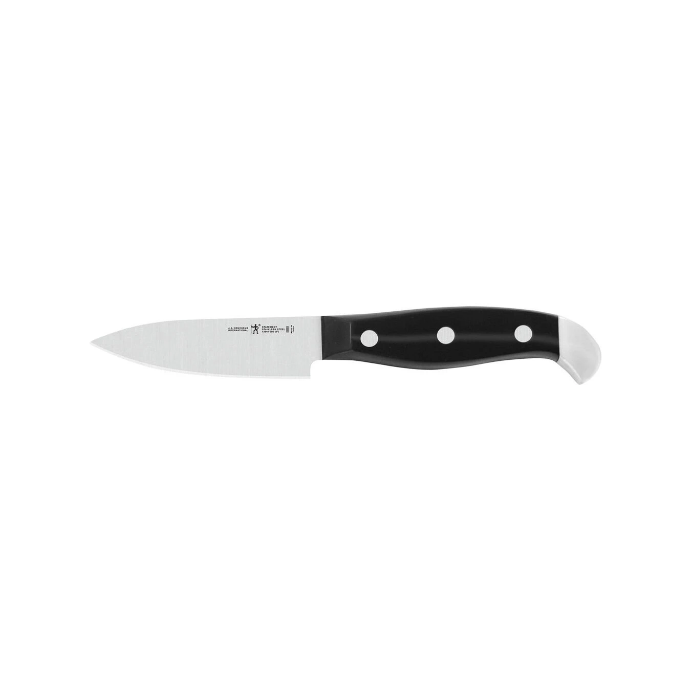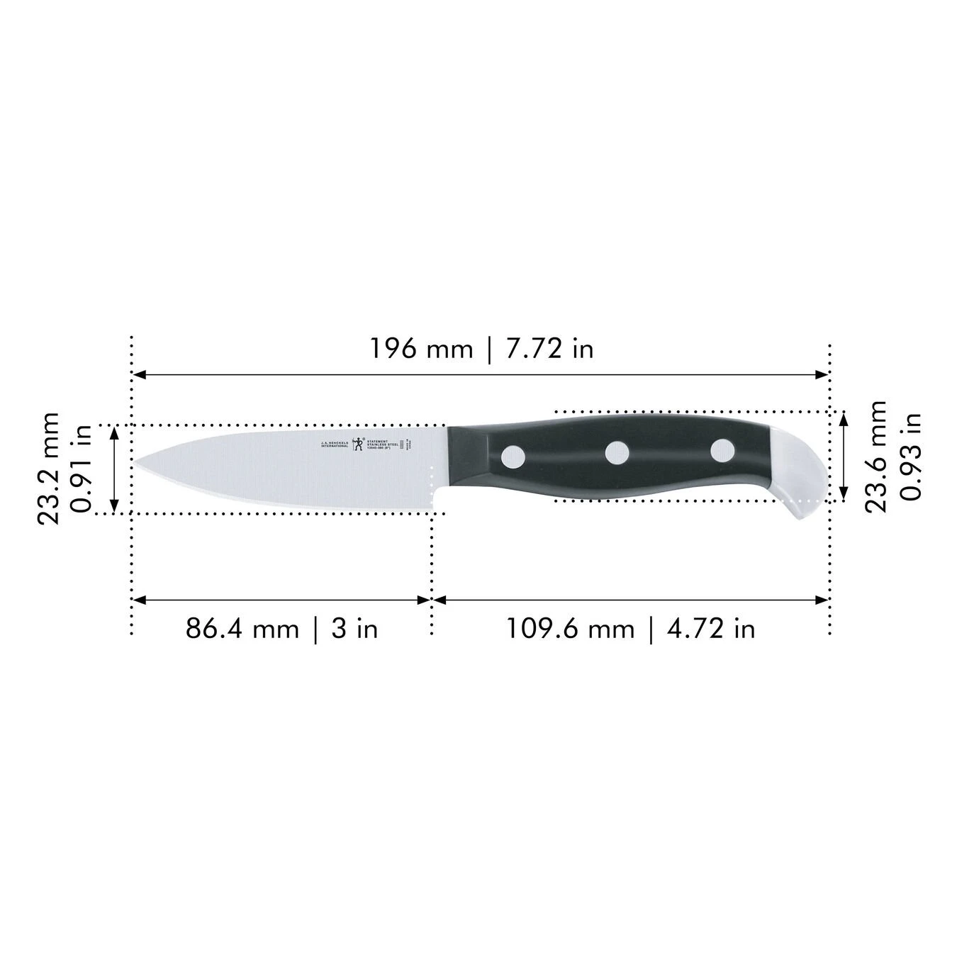 The Henckels Statement 3″ Paring Knife is perfect for tackling detailed kitchen tasks with ease. Honed for long-lasting sharpness, the fine-edge blade boasts precision cutting. Peel potatoes, remove blemishes, and create beautiful garnishes with this small, versatile knife.Fabricated from durable, high-quality stainless steel, Statement’s single-piece, stamped blade construction is lighter than forged knives. Along with the full tang, this encourages maximum maneuverability. The traditional triple-rivet handles are curved for comfort and balance while the stainless steel endcap adds aesthetic appeal to your block display. Each time you cook, you will want to reach for this useful knife set.Henckels makes essential kitchen tools every home chef needs. From steak knives to spatulas, each product boasts high quality at an exceptional value. Created in 1895 by Zwilling J.A. Henckels, this value-driven brand guarantees the same durability, design and ease of use for which the global company is known. Equip your kitchen with expertise with Henckels.