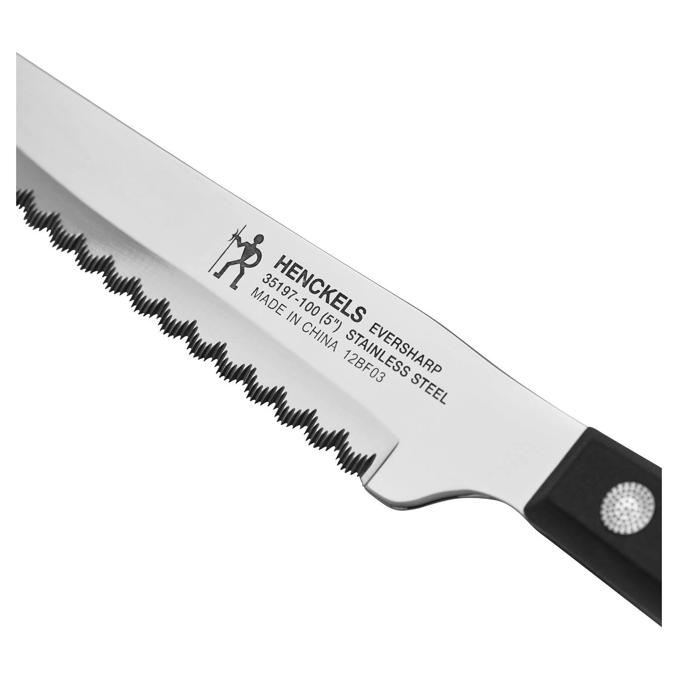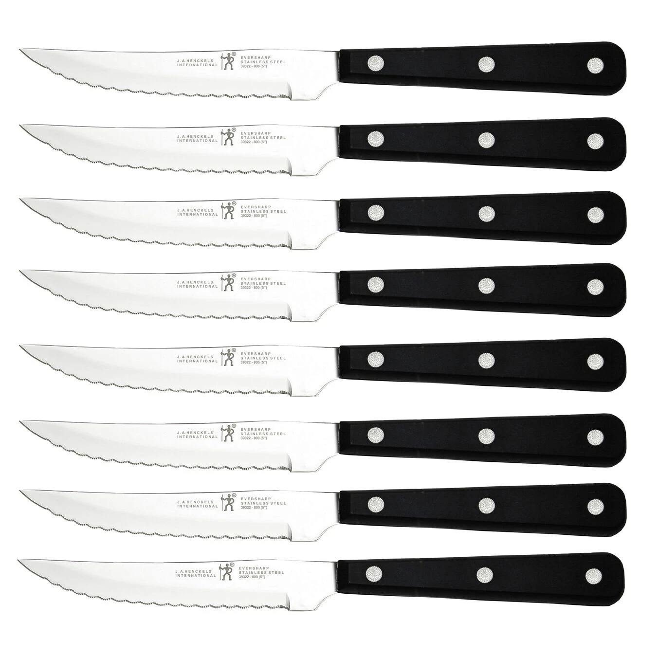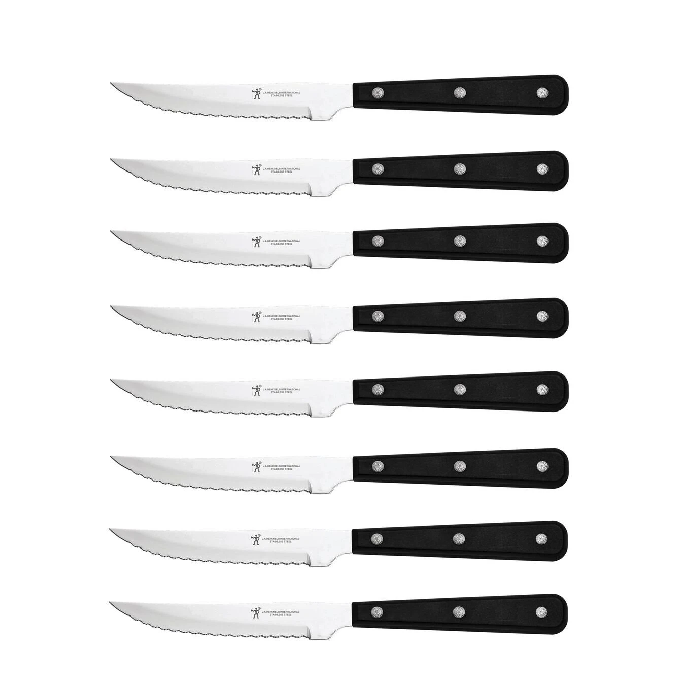 - Set features eight 4.5-inch steel blade knives that will stay sharp for years