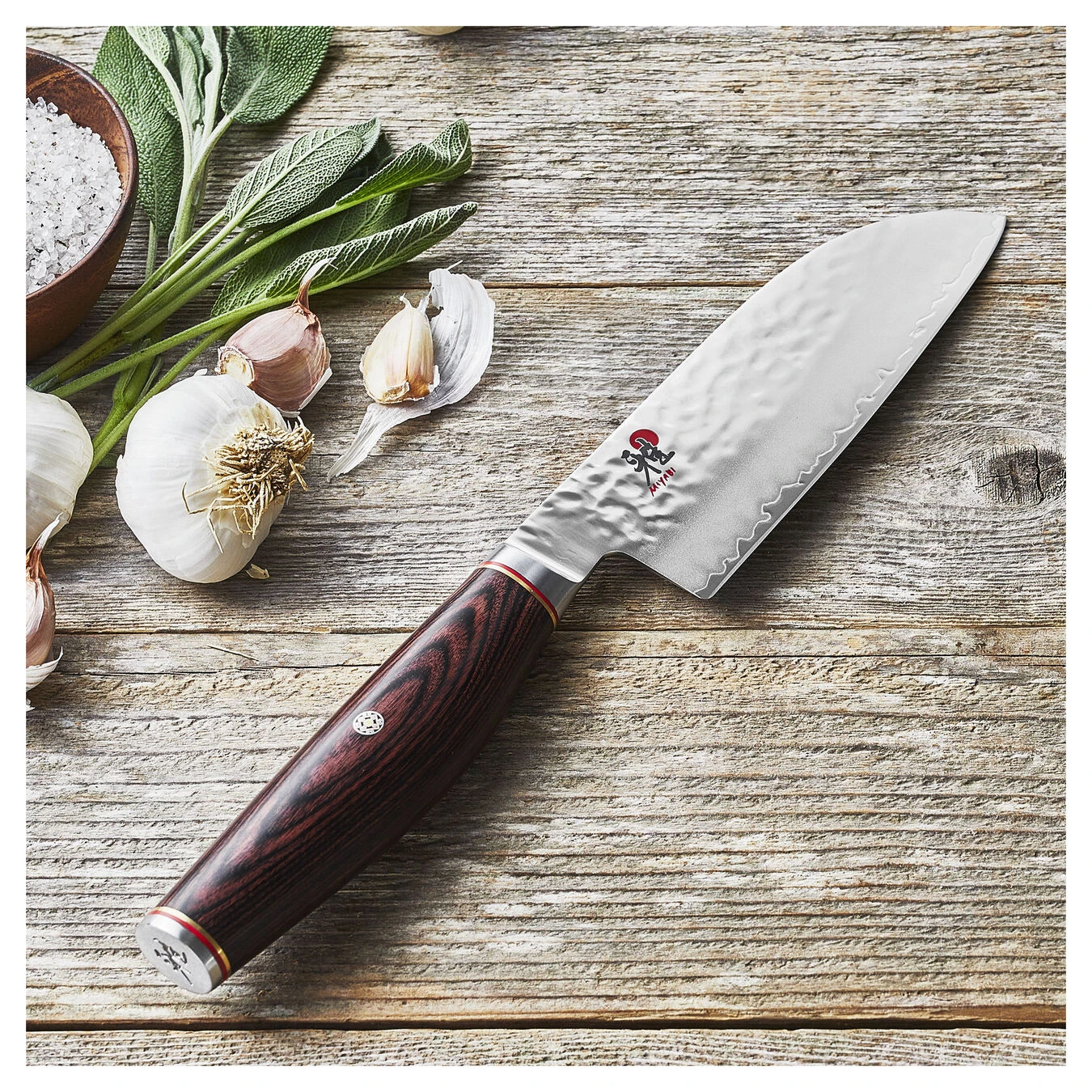 MIYABI celebrates Japanese craftsmanship with Artisan. Using traditional methods and innovative techniques, these knives merge the past and present into an exceptional knife collection.The potent core of SG2 micro-carbide powder steel is layered in a Tsuchime finish. This exquisite, hand-hammered effect helps prevent food from sticking. Each knife features a hand-honed blade finished with a true katana edge, a homage to the samurai swords made in Seki centuries ago.Fabricated with special Cocobolo Rosewood pakkawood, the handles mirror the beauty of the blade. Sophisticated details include brass and red spacers, a mosaic pin and a stainless steel end cap. The attractive D-shaped handle is designed to nestle comfortably in your hand for tireless cutting. Handcrafted in Seki, Japan.