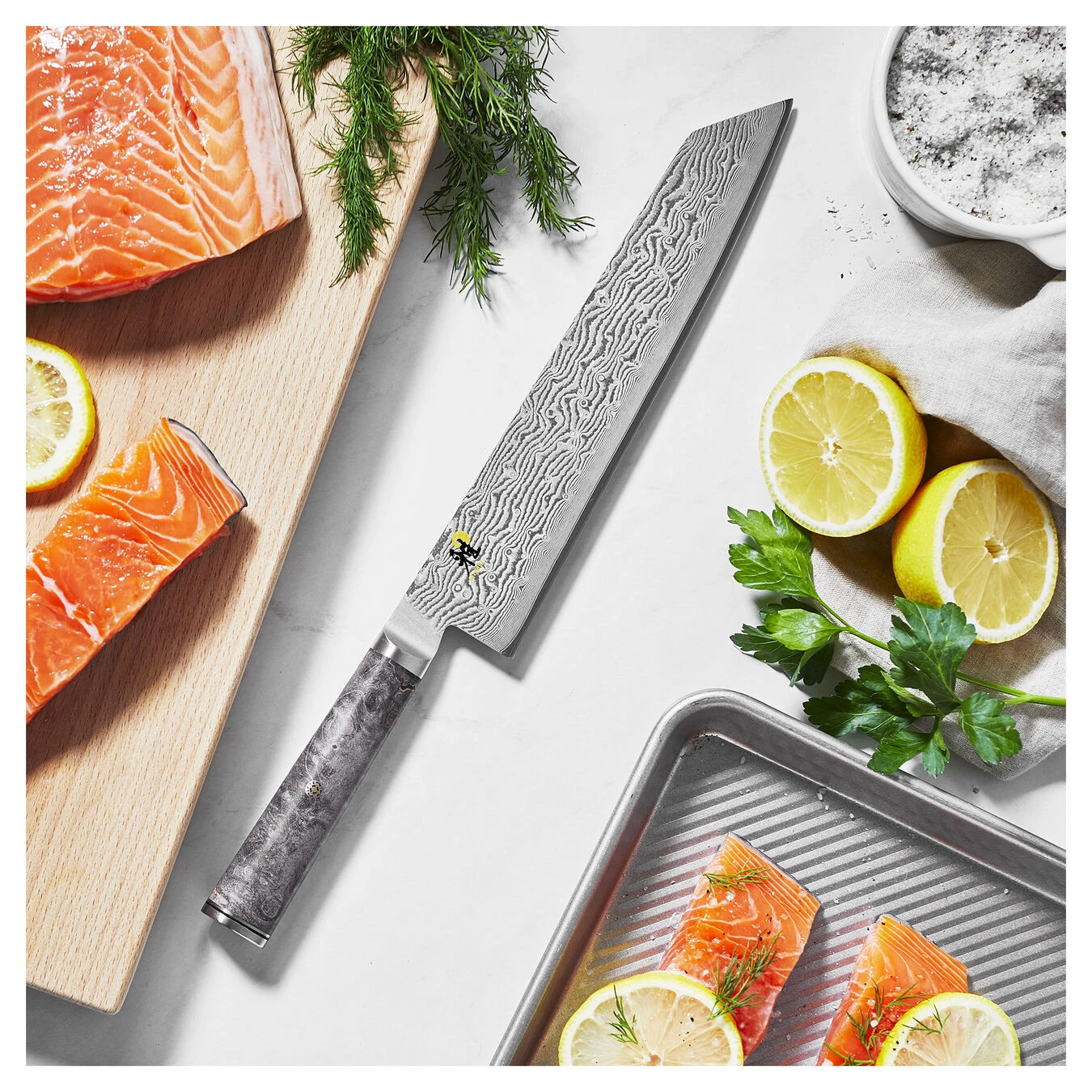 The Miyabi Black 5000MCD is a true work of art. The blade is constructed of micro-carbide powdered MC66 steel, which is ice-hardened to an impressive 66 HRC. This results in an exceptionally sharp and lasting edge. The blade is wrapped in 132 additional layers of steel, resulting in a beautiful flower damascus pattern. The handle of the Miyabi Black series is made from unique wood, black maple. The grain and color of the black maple contrasts with the damascus of the blade. The handle is crafted in a traditional “D” shape, providing optimal ergonomics for fatigue-free cutting in the kitchen. Handcrafted in Seki, Japan.