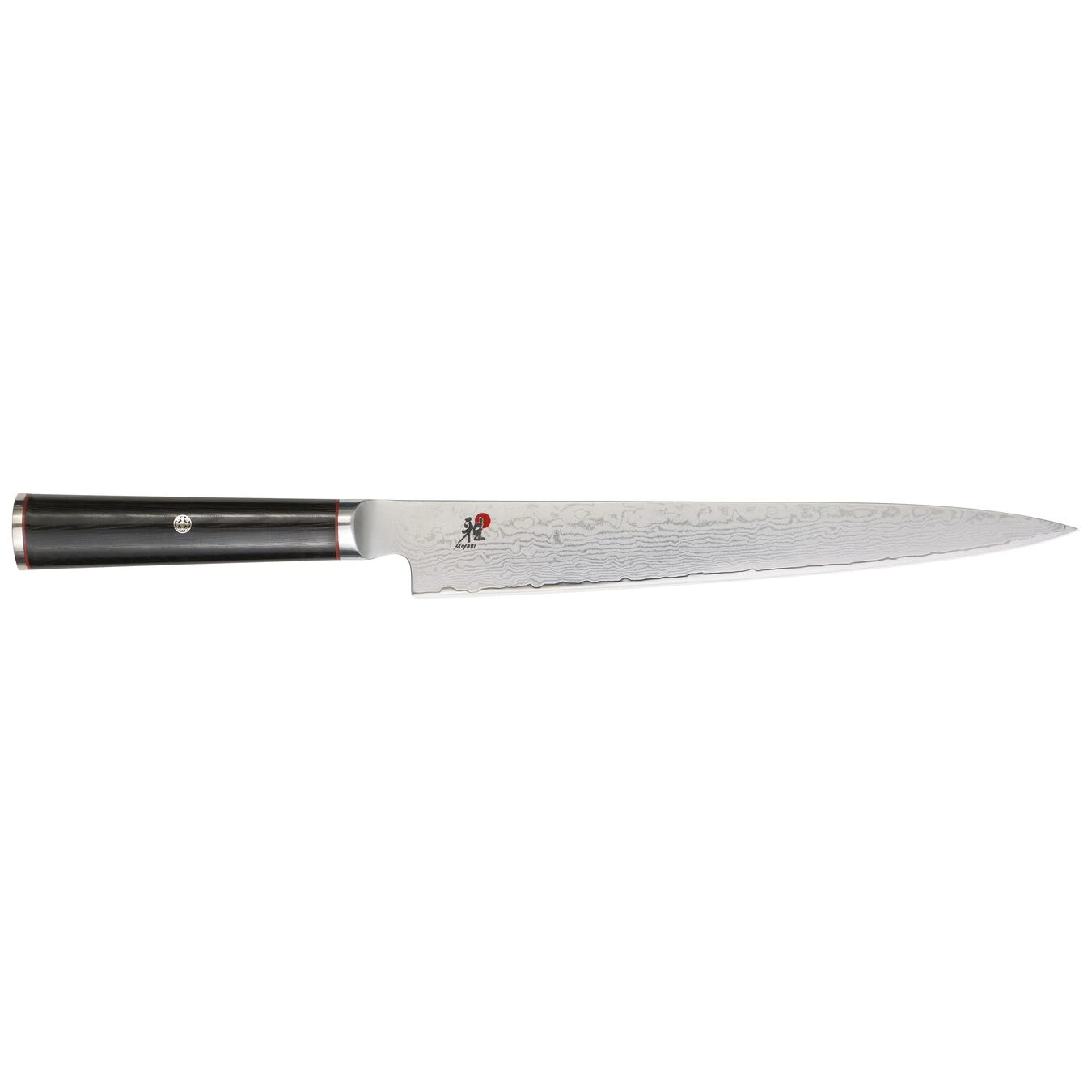MIYABI strives for perfection with Kaizen – Japanese for “improvement” or “change for the better.” This line of knives combines the best hardening technology with the artistry of traditional Japanese craftsmanship. The resilient core of VG10 super steel is protected by a stunning 64-layer flower Damascus pattern.The CRYODUR blades feature exceptional sharpness and durability thanks to their innovative, icehardening treatment. Then, artisans hand-hone the blades with the historic Honbazuke method. This attention to detail translates into precision cutting for MIYABI Kaizen users.The blade is balanced by a refined D-shaped handle made of black linen Micarta. With a wood-like texture, the comfortable handle won’t slip from your hand and acts as a moisture repellant. Handcrafted in Seki, Japan.