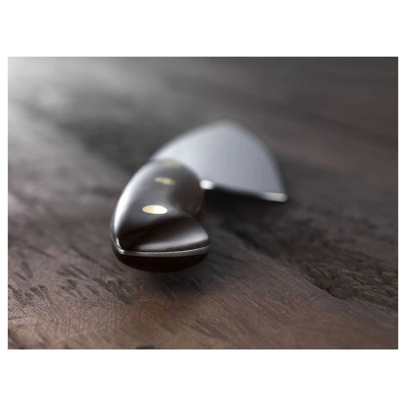 - Grenadile wood handle with brass rivets and Bob Kramer mosaic pin