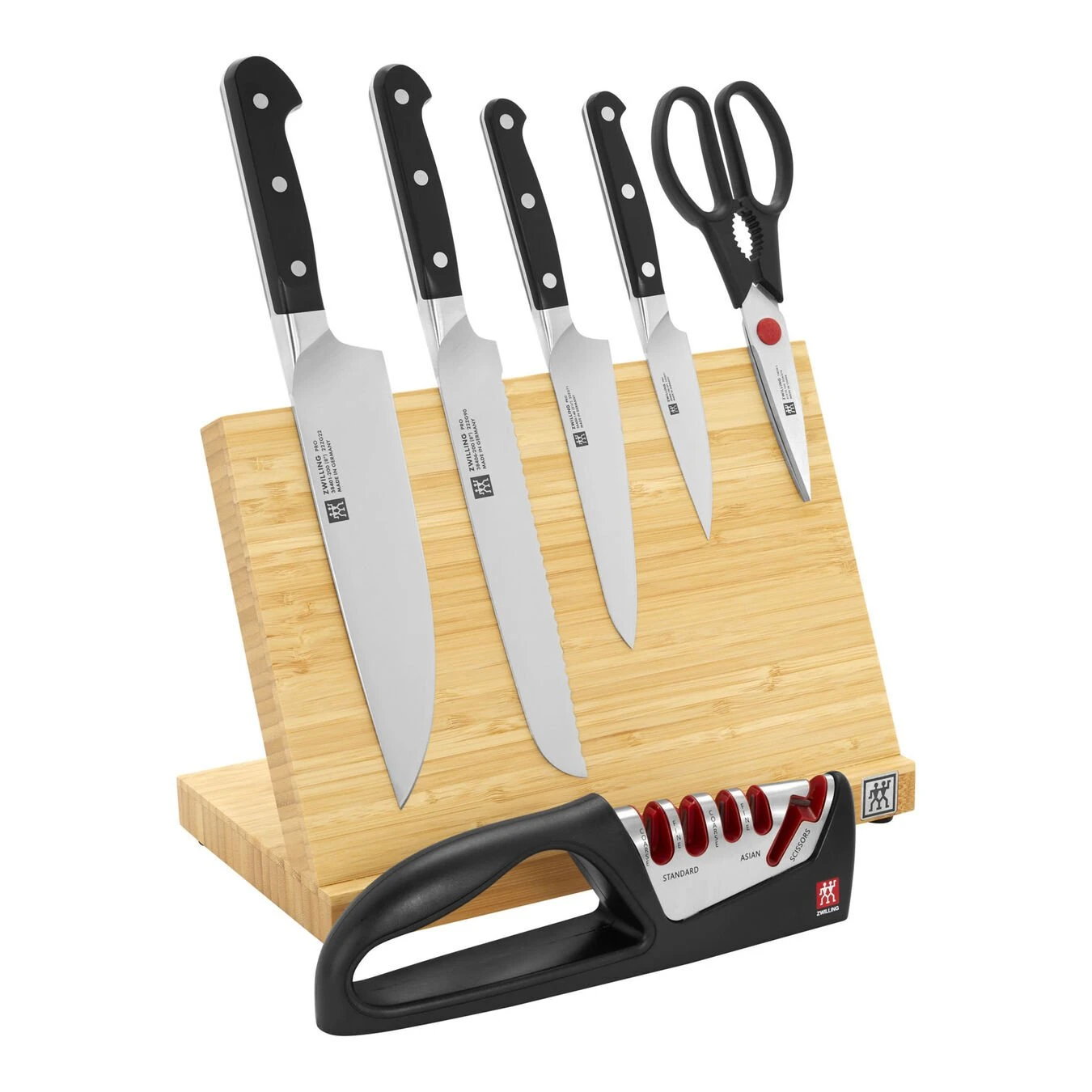 - Set includes: 4-inch paring, 5.5-inch prep, 8-inch chef’s, 8-inch bread, kitchen shears, 4-stage sharpener with shear sharpener, bamboo magnetic easel