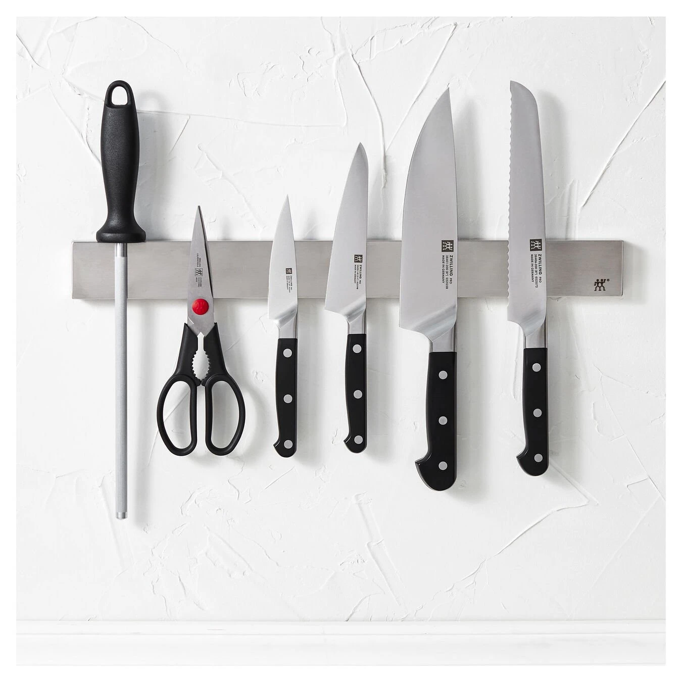 ZWILLING Pro is the most user-friendly knife available to market. The unique blade shape and ergonomic bolster are the result of 280 years of experience in knife making, and the rigorous study of how knives are used. A unique curved bolster supports the professional pinch grip, with thumb and index finger on the blade, for safe cutting and less fatigue. The Chef’s Knife blade was redesigned with a broader curve in the front to facilitate the rocking motion of Western cutting, while the straight back is ideal for the Asian chopping motion. The full length of the blade can be used when cutting and can be sharpened from bolster to tip. Designed in Italy by Matteo Thun and made in Germany by ZWILLING J.A. Henckels, the company that sets the standard for exceptional cutlery worldwide. Set includes 4″ Paring Knife, 5.5″ Prep Knife, 8″ Bread Knife, 8″ Chef’s Knife, TWIN Shears, TWIN Sharpening Steel, and 17.5″ Stainless Magnetic Knife Bar
