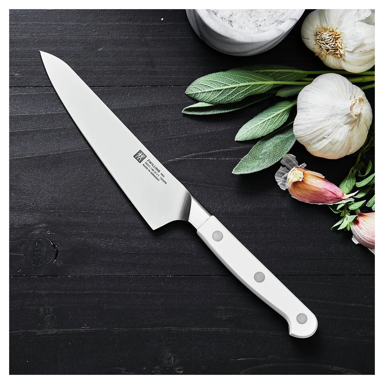 ZWILLING Pro, the most user-friendly knife on the market, is now available with elegant matte white handles. ZWILLING Pro Le Blanc boasts a unique curved bolster that acts as an extension of the hand, supporting the professional pinch grip, with thumb and index finger on the blade, for safe cutting and less fatigue. The blade was designed with a broad curve in the front to facilitate the rocking motion of Western cutting, while the straight back is ideal for the Asian chopping motion. The full length of the blade can be used when cutting and can be sharpened from bolster to tip.