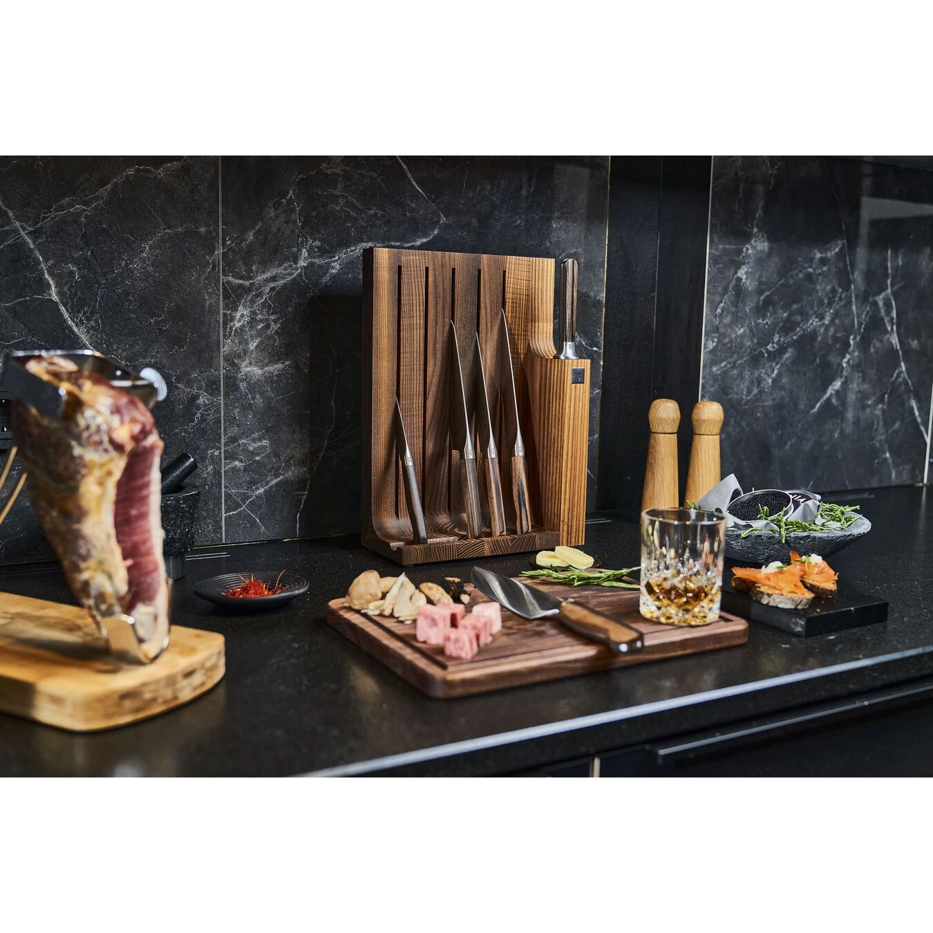 TWIN 1731 is designed by the internationally acclaimed designer Matteo Thun. Years of work culminated in the ZWILLING wedge geometry that improves comfort and optimizes cutting technique. This innovative curved bolster is meant to be an extension of the hand, supporting the professional grip with thumb and index finger on the bladeDeveloped for bearings in aerospace engineering, the highperformance Cronidur 30 steel boasts impressive toughness and corrosion resistance that is 100 times higher than standard steel. Combined with ZWILLING’s signature ice-hardening technique, this FRIODUR blade is exceptionally sharp and durable.Each knife is precision-forged with ZWILLING’s SIGMAFORGE process, resulting in a remarkably sturdy, balanced and flexible blade. With an incredibly sharp, laser-controlled edge, the knives are honed and hand-finished by the most skilled artisans.